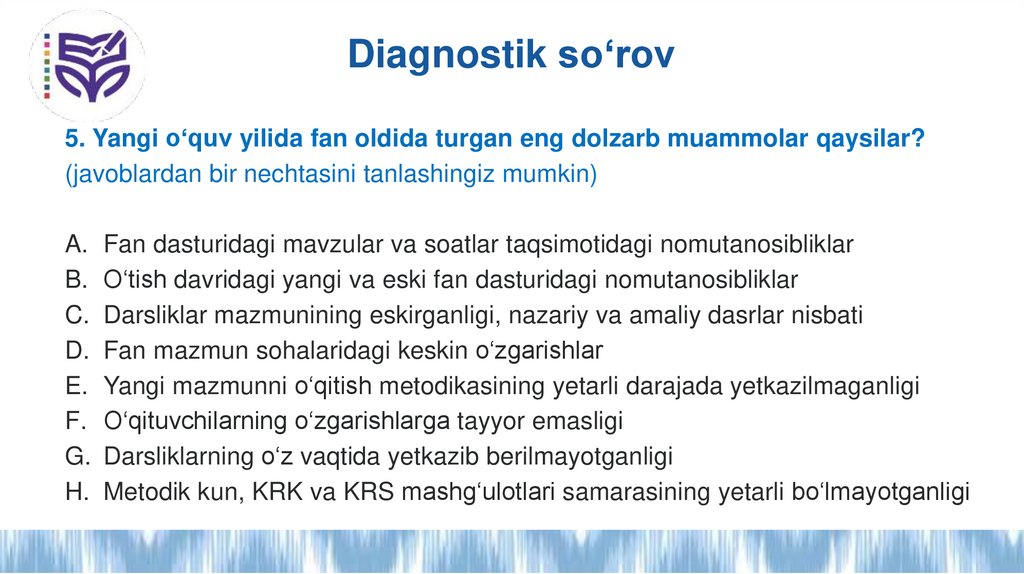 Diagnostik so‘rov5. Yangi o‘quv yilida fan oldida turgan eng dolzarb muammolar qaysilar?