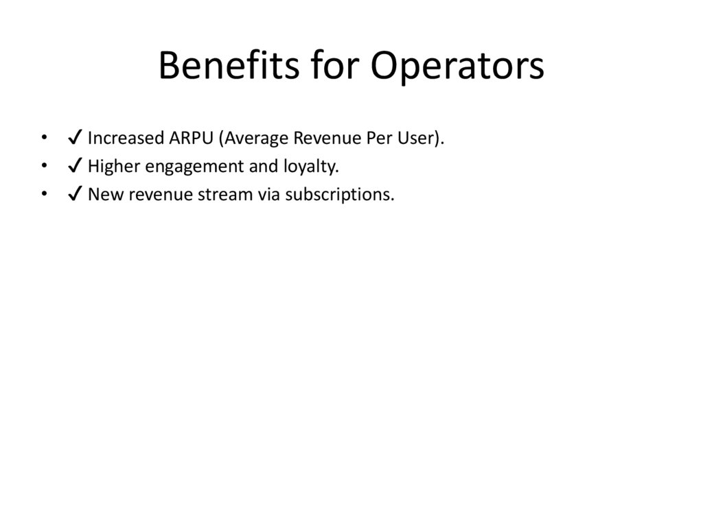 Benefits for Operators• ✔ Increased ARPU (Average Revenue Per User).