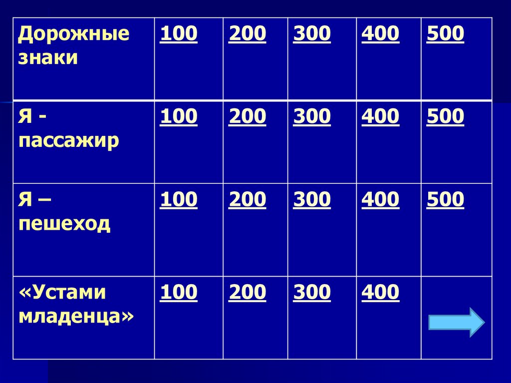 Своя игра «Обязанности пешеходов и пассажиров»»