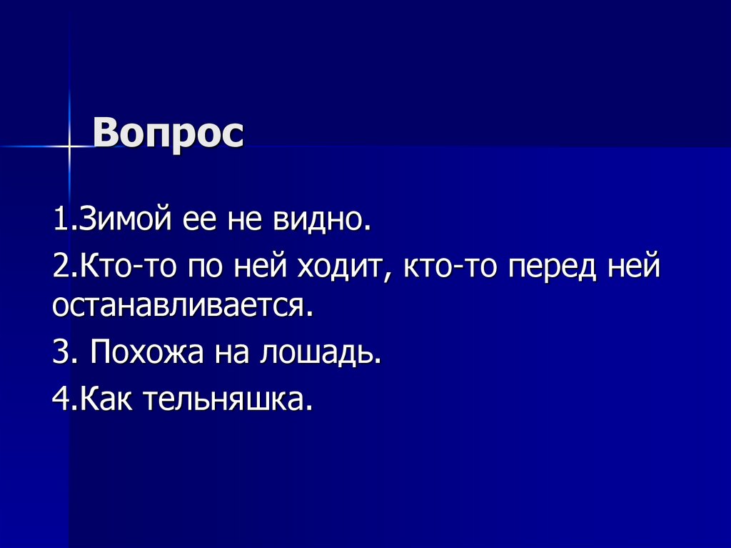 1.Зимой ее не видно.2.Кто-то по ней ходит, кто-то перед ней