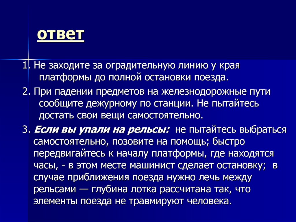 1. Не заходите за оградительную линию у краяплатформы до полной остановки поезда.