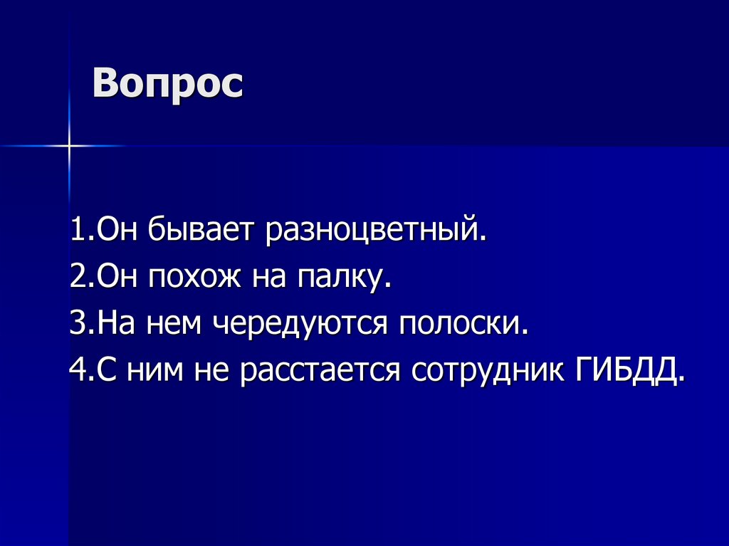 1.Он бывает разноцветный.2.Он похож на палку.