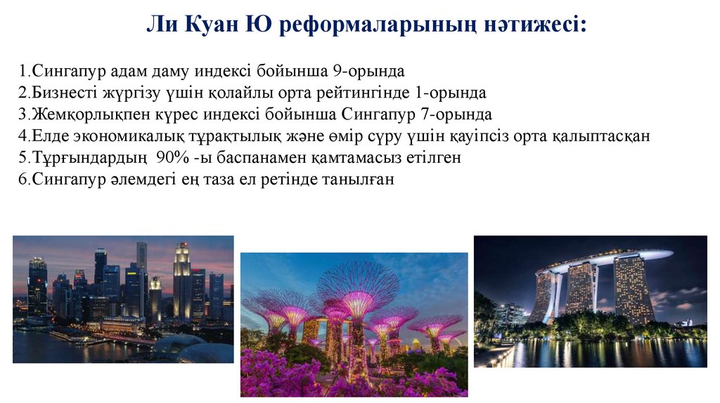 Ли Куан Ю реформаларының нәтижесі:1.Сингапур адам даму индексі бойынша 9-орында