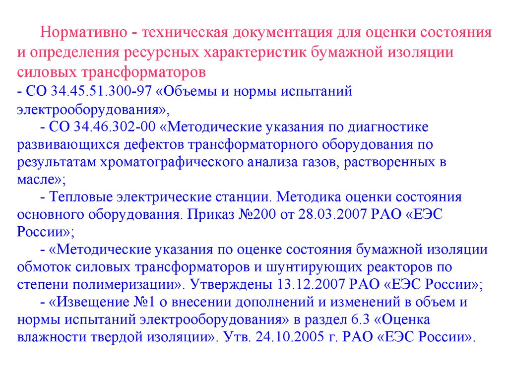 Нормативно - техническая документация для оценки состоянияи определения ресурсных характеристик бумажной изоляции