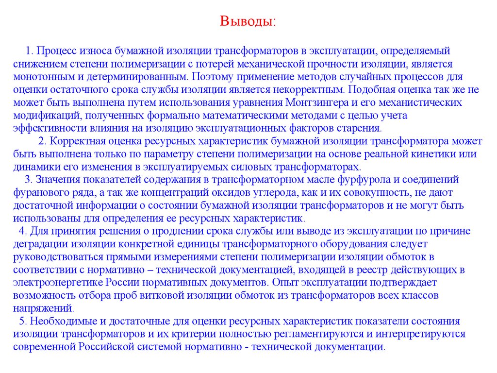 Выводы:1. Процесс износа бумажной изоляции трансформаторов в эксплуатации, определяемый