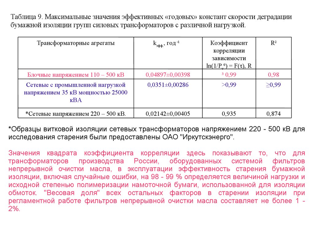 Таблица 9. Максимальные значения эффективных «годовых» констант скорости деградациибумажной изоляции групп силовых трансформаторов с различной нагрузкой.