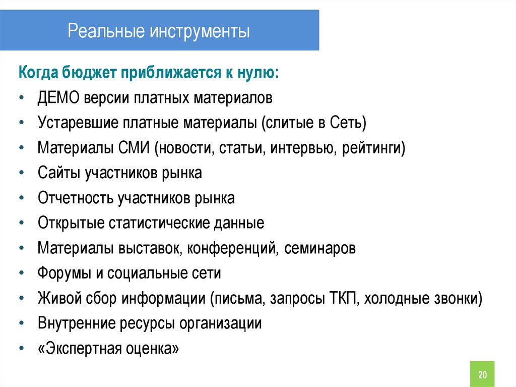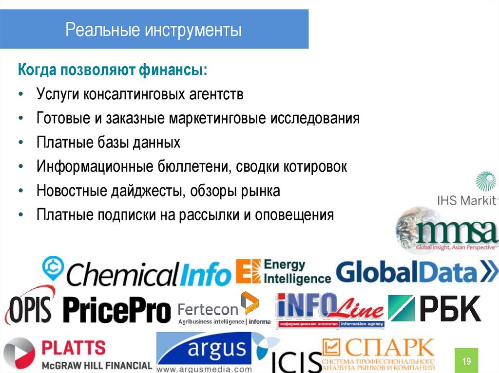 Когда позволяют финансы:• Услуги консалтинговых агентств