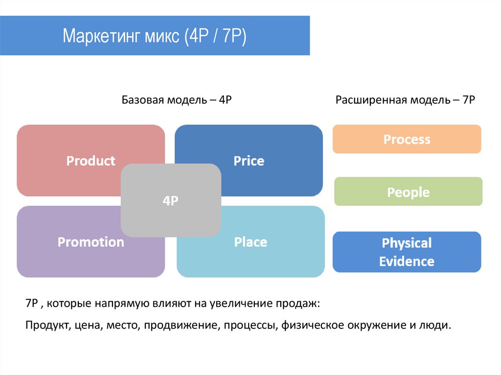 Продукт, цена, место, продвижение, процессы, физическое окружение и люди.