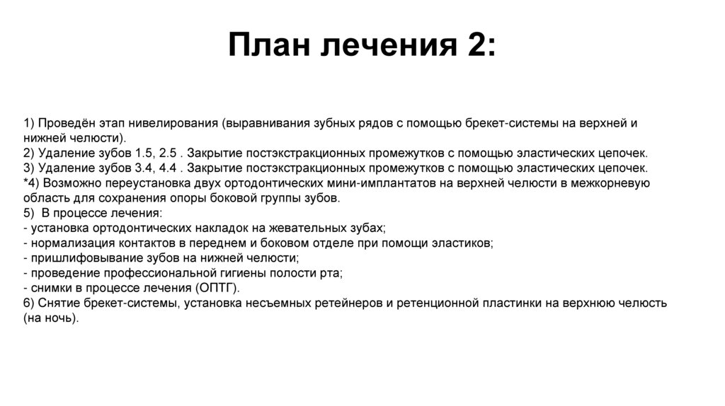 План лечения 2:1) Проведён этап нивелирования (выравнивания зубных рядов с помощью брекет-системы на верхней и