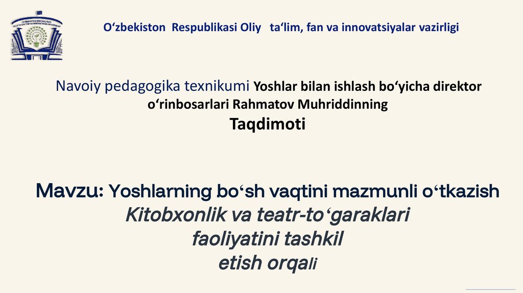 O‘zbekiston Respublikasi Oliy ta‘lim, fan va innovatsiyalar vazirligiNavoiy pedagogika texnikumi Yoshlar bilan ishlash boʻyicha direktor