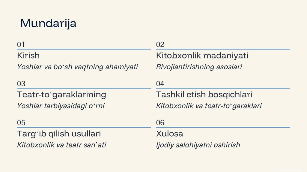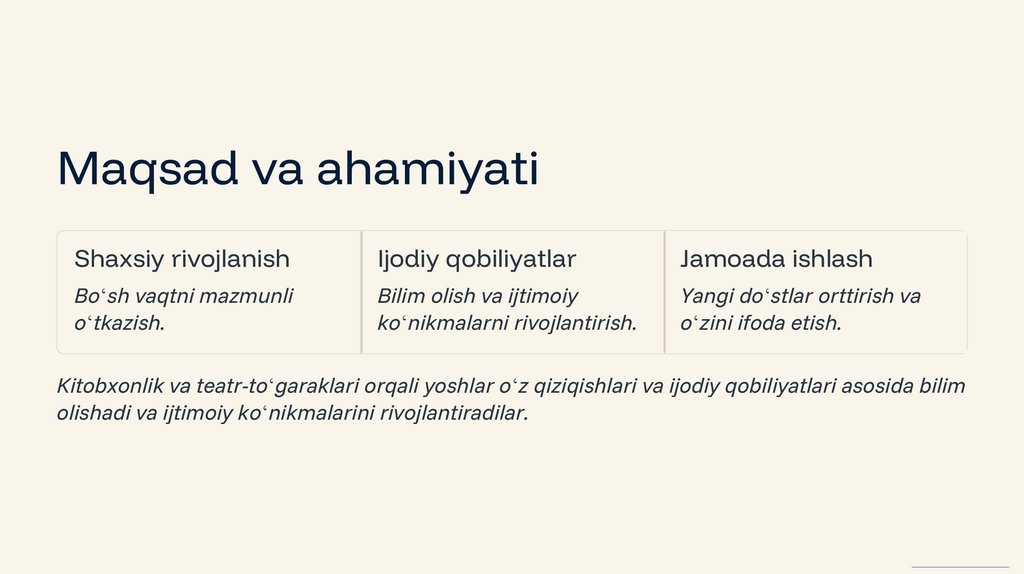 Yoshlarning boʻsh vaqtini mazmunli oʻtkazish. Kitobxonlik va teatr-toʻgaraklari faoliyatini tashkil etish orqali
