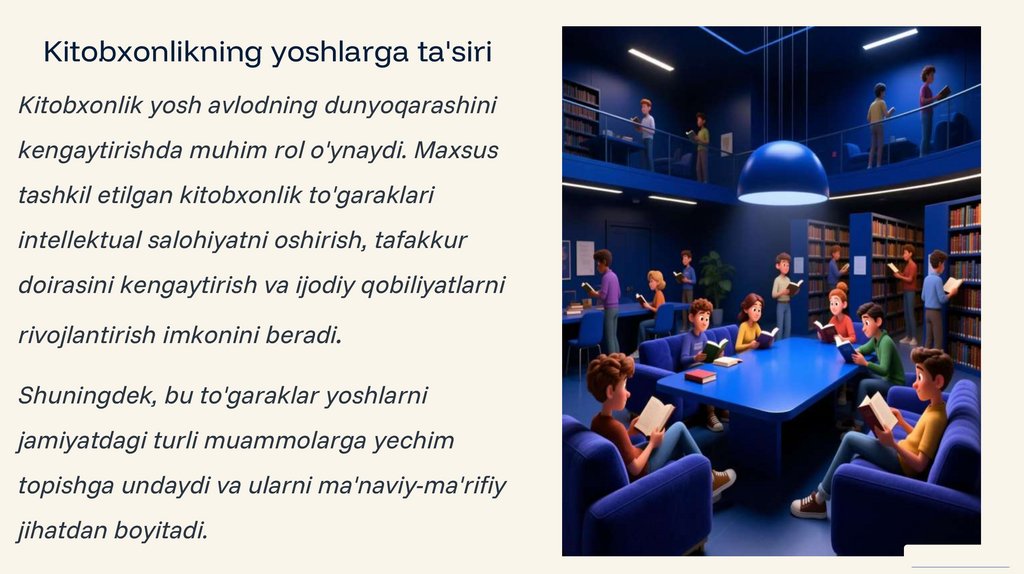 Kitobxonlikning yoshlarga ta'siriKitobxonlik yosh avlodning dunyoqarashini