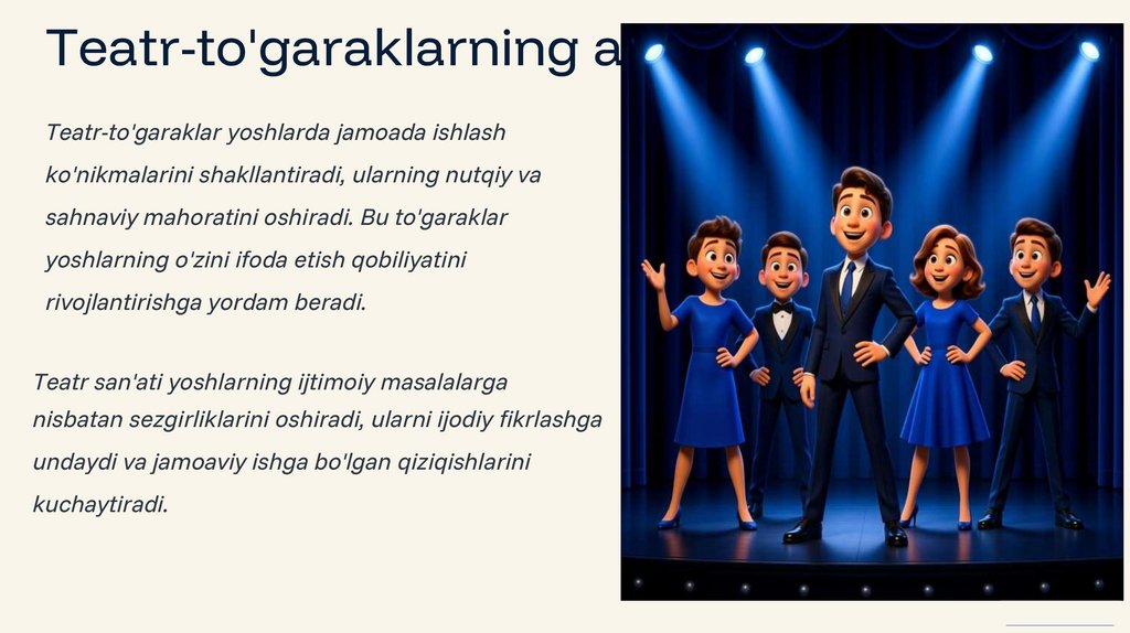 Teatr-to'garaklarning ahamiyatiTeatr-to'garaklar yoshlarda jamoada ishlash
