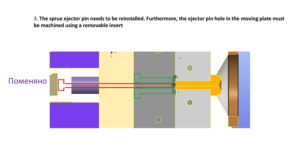 3. The sprue ejector pin needs to be reinstalled. Furthermore, the ejector pin hole in the moving plate mustbe machined using a removable insert