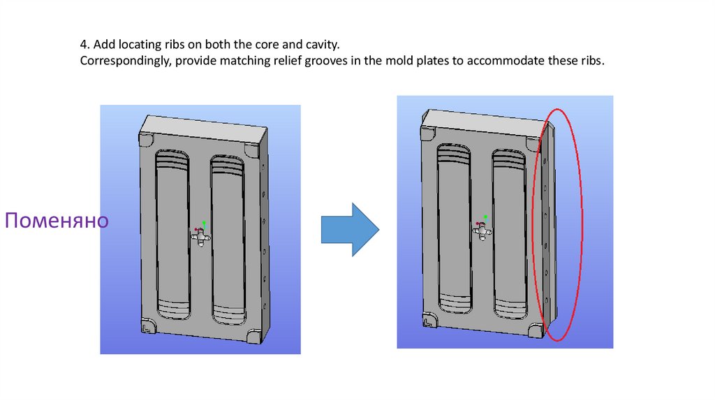 4. Add locating ribs on both the core and cavity.Correspondingly, provide matching relief grooves in the mold plates to accommodate these ribs.
