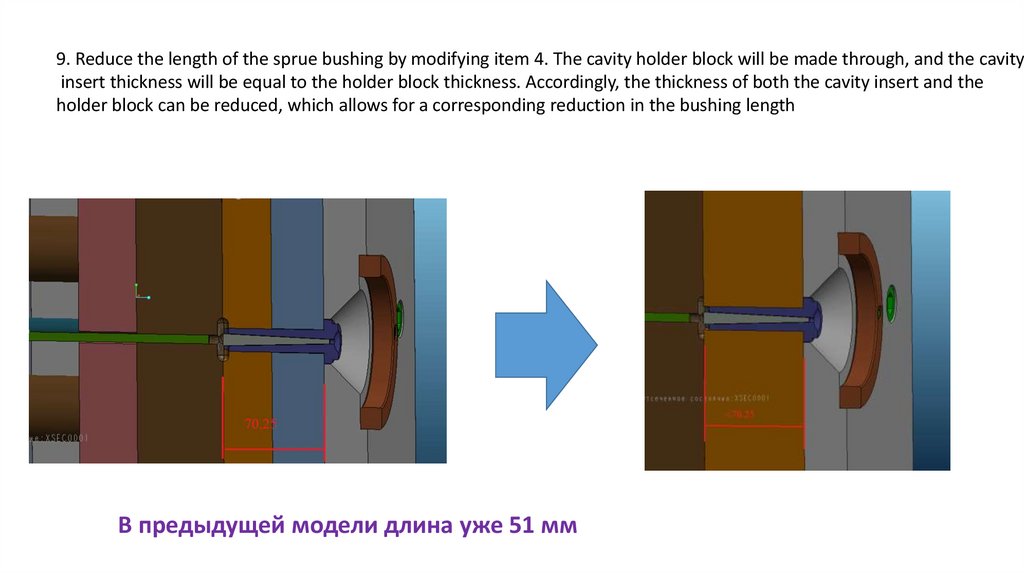 9. Reduce the length of the sprue bushing by modifying item 4. The cavity holder block will be made through, and the cavityinsert thickness will be equal to the holder block thickness. Accordingly, the thickness of both the cavity insert and the