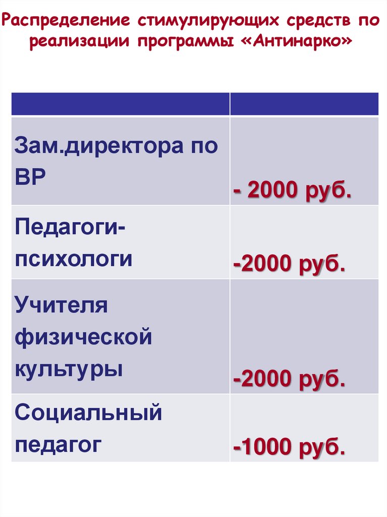 6. Распределение стимулирующих средств по реализации программы «Антинарко»