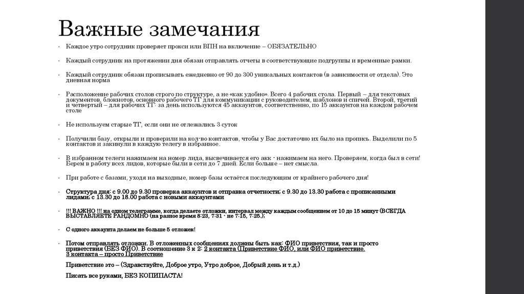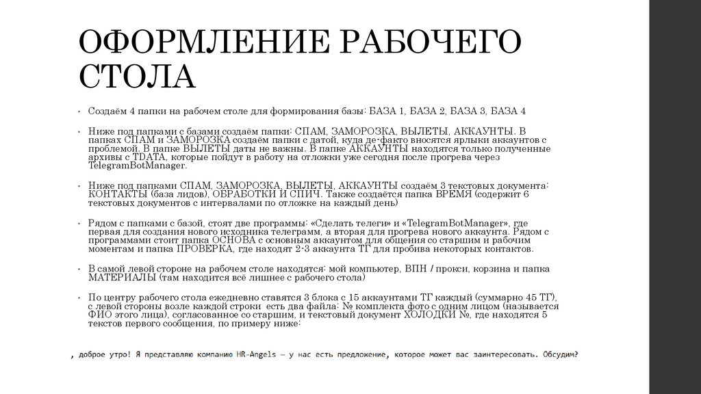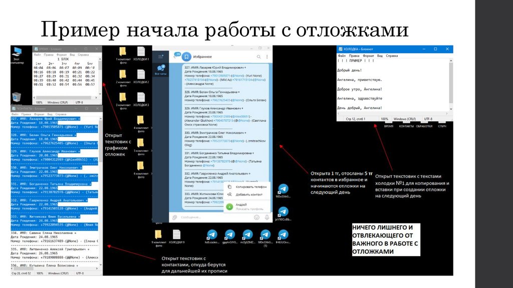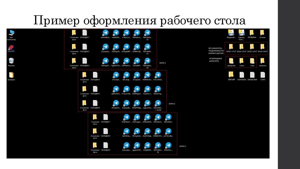 По центру рабочего стола ежедневно ставятся 3 блока с 15 аккаунтами ТГ каждый (суммарно 45 ТГ),