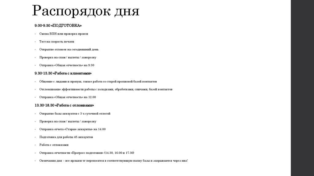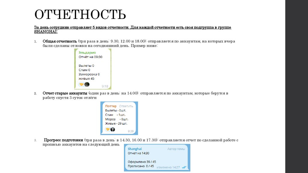 Общая отчетность (три раза в день: 9.30, 12.00 и 18.00): отправляется по аккаунтам, на которых вчера