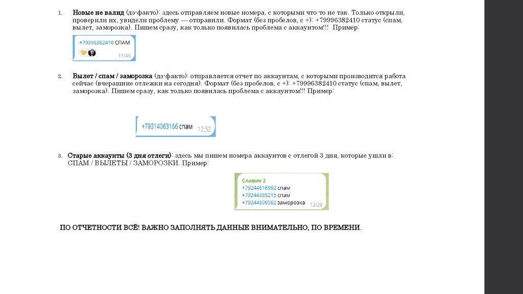 сейчас (вчерашние отлежки на сегодня). Формат (без пробелов, с +): +79996382410 статус (спам, вылет,