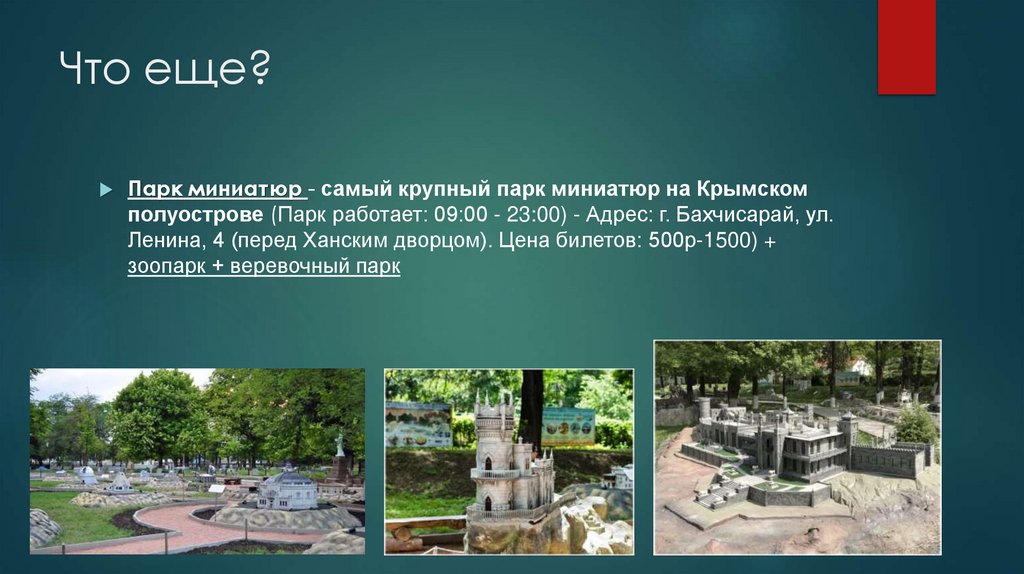 Парк миниатюр - самый крупный парк миниатюр на Крымскомполуострове (Парк работает: 09:00 - 23:00) - Адрес: г. Бахчисарай, ул.