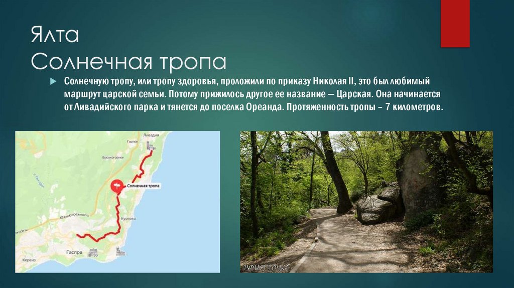 Солнечную тропу, или тропу здоровья, проложили по приказу Николая II, это был любимыймаршрут царской семьи. Потому прижилось другое ее название — Царская. Она начинается