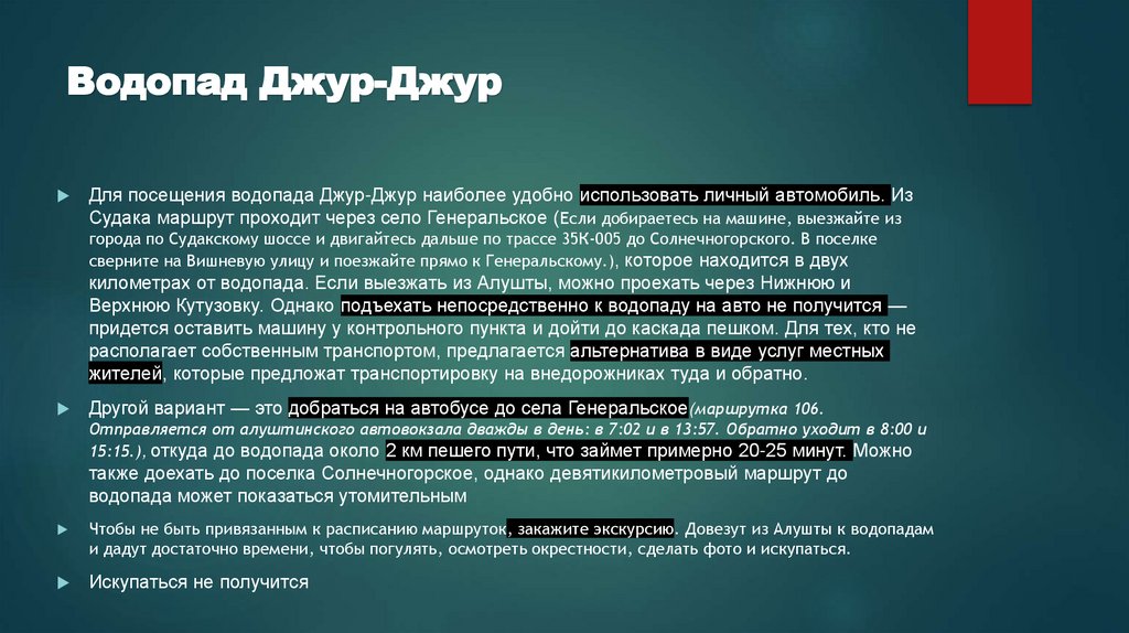 Для посещения водопада Джур-Джур наиболее удобно использовать личный автомобиль. ИзСудака маршрут проходит через село Генеральское (Если добираетесь на машине, выезжайте из