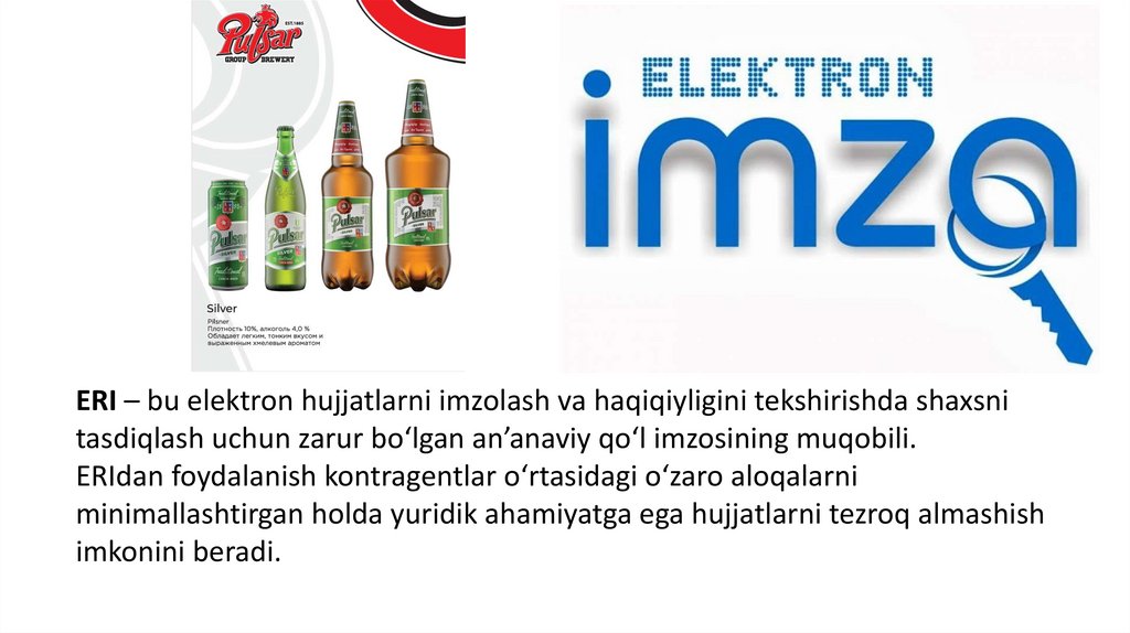 ERI – bu elektron hujjatlarni imzolash va haqiqiyligini tekshirishda shaxsnitasdiqlash uchun zarur bo‘lgan an’anaviy qo‘l imzosining muqobili.