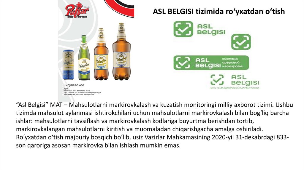 ASL BELGISI tizimida ro‘yxatdan o‘tish“Asl Belgisi” MAT – Mahsulotlarni markirovkalash va kuzatish monitoringi milliy axborot tizimi. Ushbu