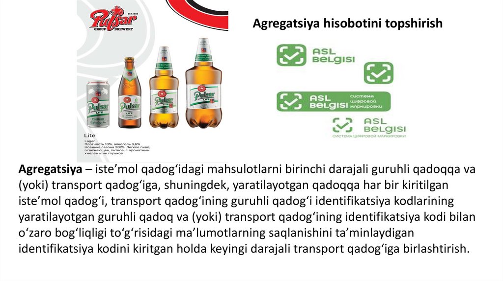 Agregatsiya hisobotini topshirishAgregatsiya – iste’mol qadog‘idagi mahsulotlarni birinchi darajali guruhli qadoqqa va