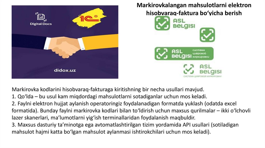 Markirovka kodlarini hisobvaraq-fakturaga kiritishning bir necha usullari mavjud.