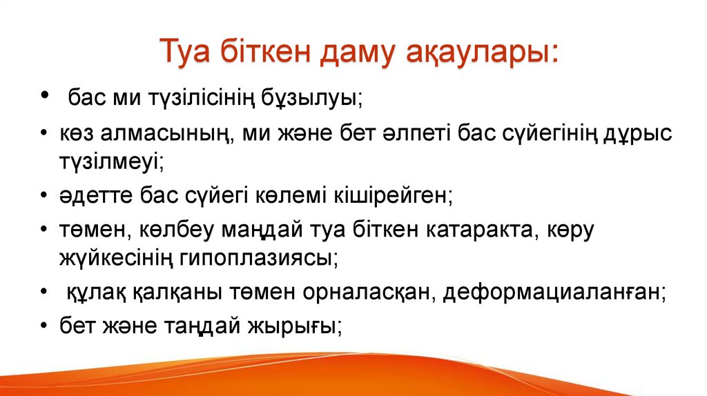 Туа біткен даму ақаулары:• бас ми түзілісінің бұзылуы;
