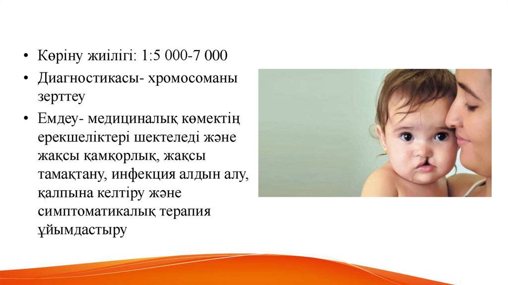 • Көріну жиілігі: 1:5 000-7 000• Диагностикасы- хромосоманы