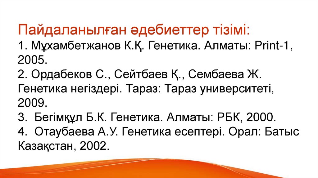 Пайдаланылған әдебиеттер тізімі:1. Мұхамбетжанов К.Қ. Генетика. Алматы: Print-1,