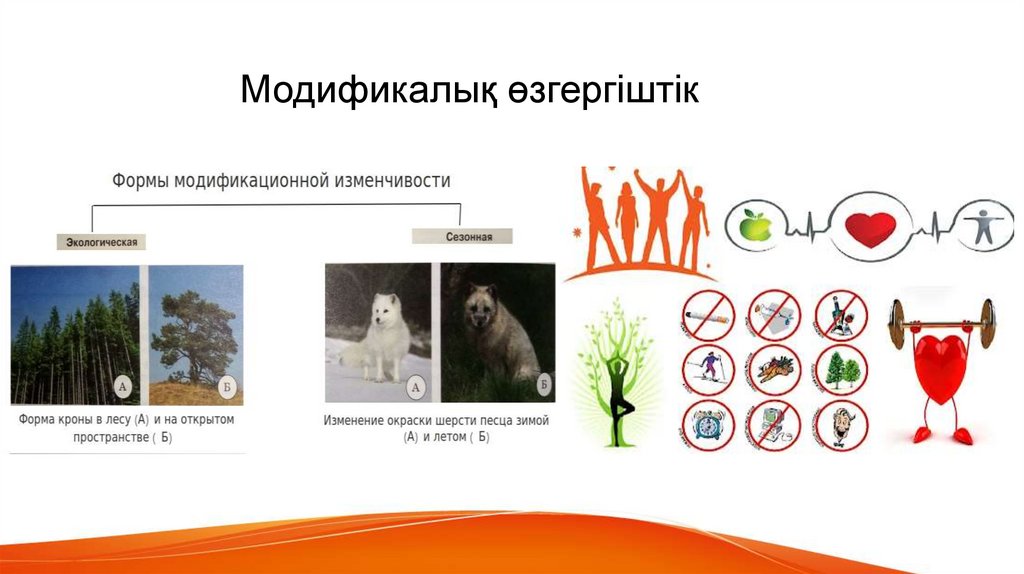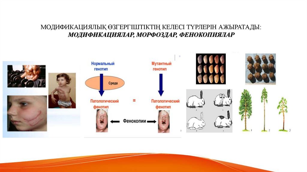 МОДИФИКАЦИЯЛЫҚ ӨЗГЕРГІШТІКТІҢ КЕЛЕСІ ТҮРЛЕРІН АЖЫРАТАДЫ:МОДИФИКАЦИЯЛАР, МОРФОЗДАР, ФЕНОКОПИЯЛАР