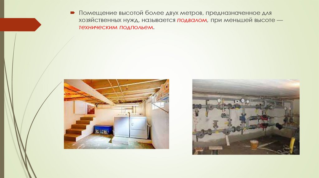 Помещение высотой более двух метров, предназначенное дляхозяйственных нужд, называется подвалом, при меньшей высоте —