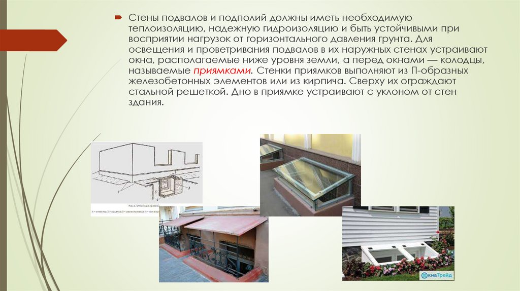 окна, располагаемые ниже уровня земли, а перед окнами — колодцы,