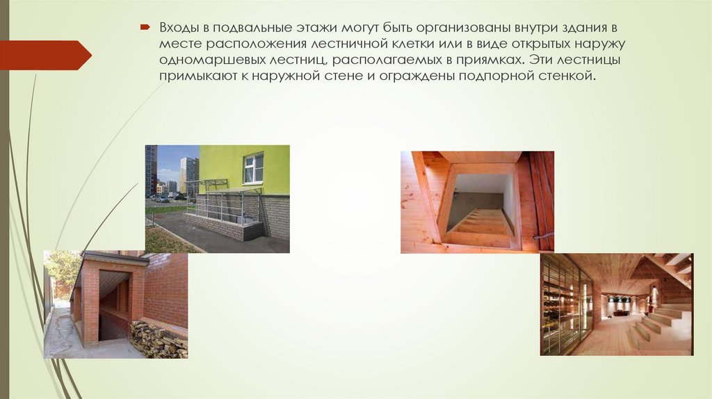 Входы в подвальные этажи могут быть организованы внутри здания вместе расположения лестничной клетки или в виде открытых наружу