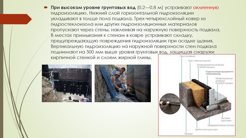 При высоком уровне грунтовых вод (0,2—0,8 м) устраивают оклееннуюгидроизоляцию. Нижний слой горизонтальной гидроизоляции