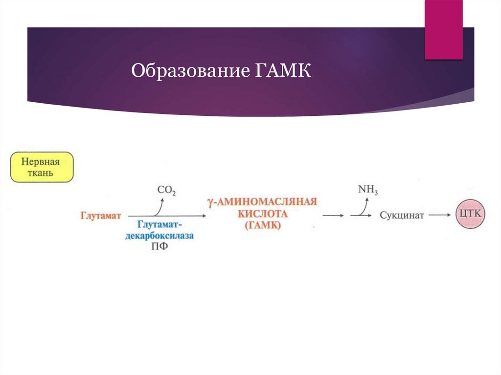 Активация синтеза глутамина из глутамата → Снижение синтеза ГАМК
