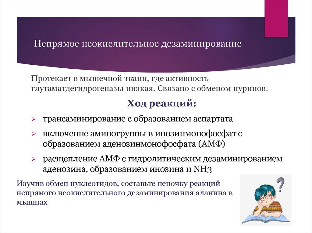 Протекает в мышечной ткани, где активностьглутаматдегидрогеназы низкая. Связано с обменом пуринов.