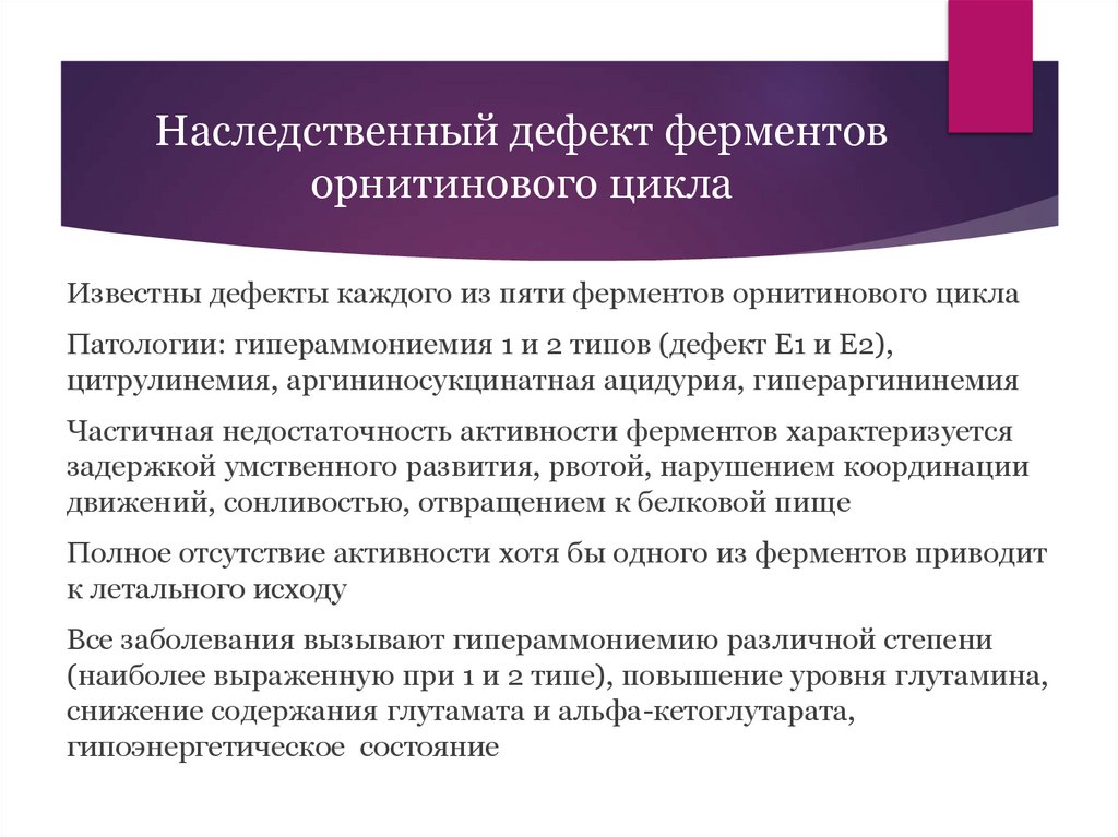 Известны дефекты каждого из пяти ферментов орнитинового циклаПатологии: гипераммониемия 1 и 2 типов (дефект Е1 и Е2),