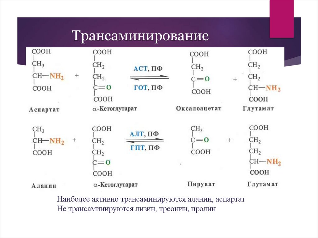 Наиболее активно трансаминируются аланин, аспартатНе трансаминируются лизин, треонин, пролин