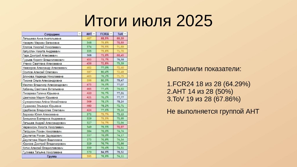 Итоги июля 2025Выполнили показатели: