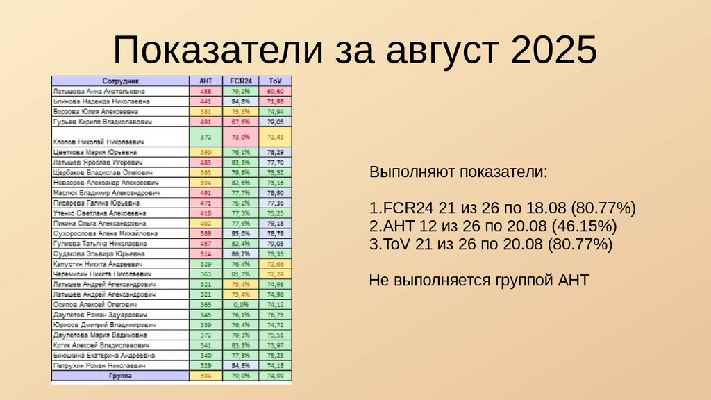 Показатели за август 2025Выполняют показатели: