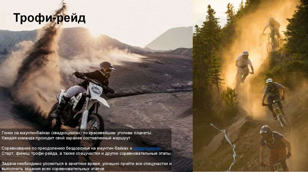 Трофи-рейдГонки на маунтинбайках (квадроциклах) по красивейшим уголкам планеты.