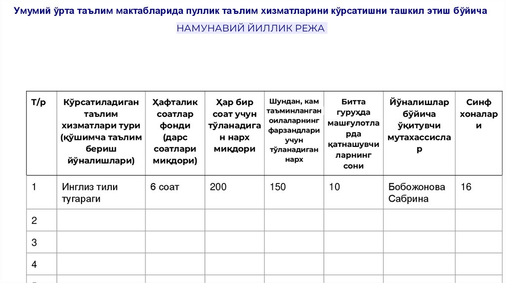 Умумий ўрта таълим мактабларида пуллик таълим хизматларини кўрсатишни ташкил этиш бўйичаНАМУНАВИЙ ЙИЛЛИК РЕЖА