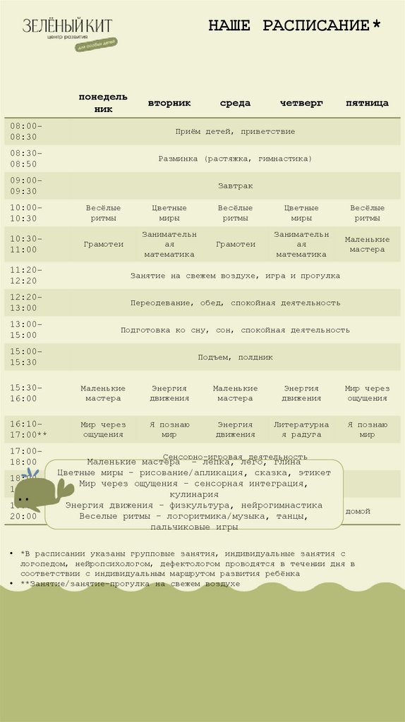 • *В расписании указаны групповые занятия, индивидуальные занятия с