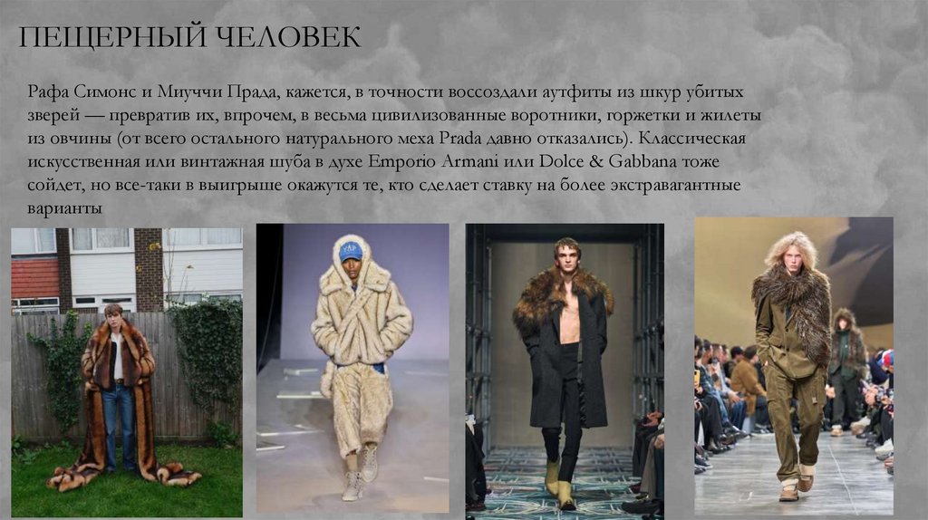 ПЕЩЕРНЫЙ ЧЕЛОВЕКРафа Симонс и Миуччи Прада, кажется, в точности воссоздали аутфиты из шкур убитых