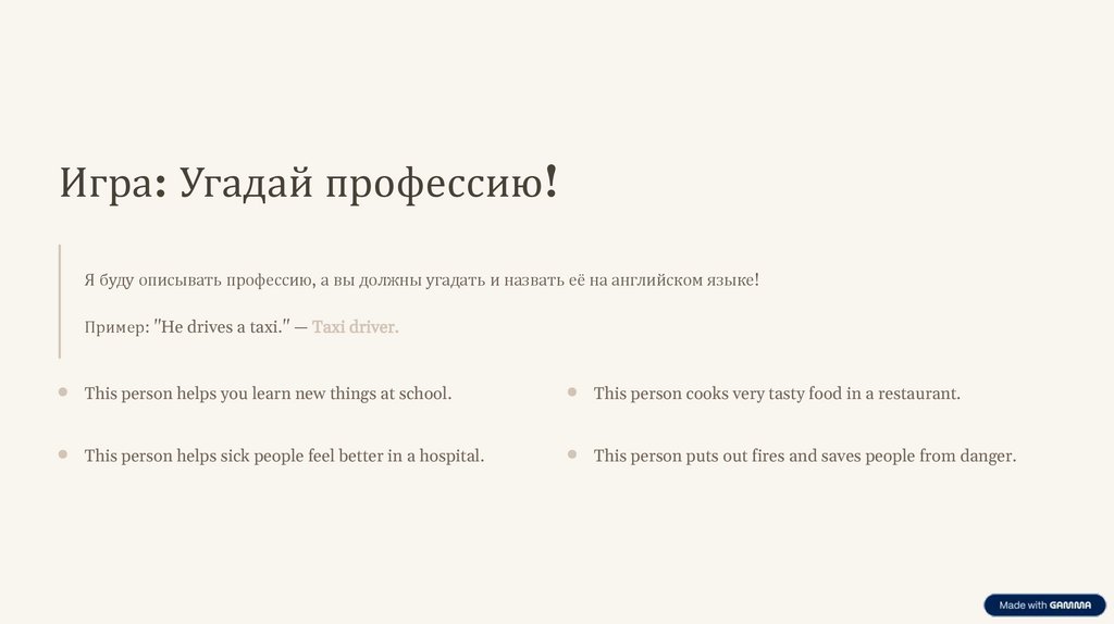 Игра: Угадай профессию!Я буду описывать профессию, а вы должны угадать и назвать её на английском языке!